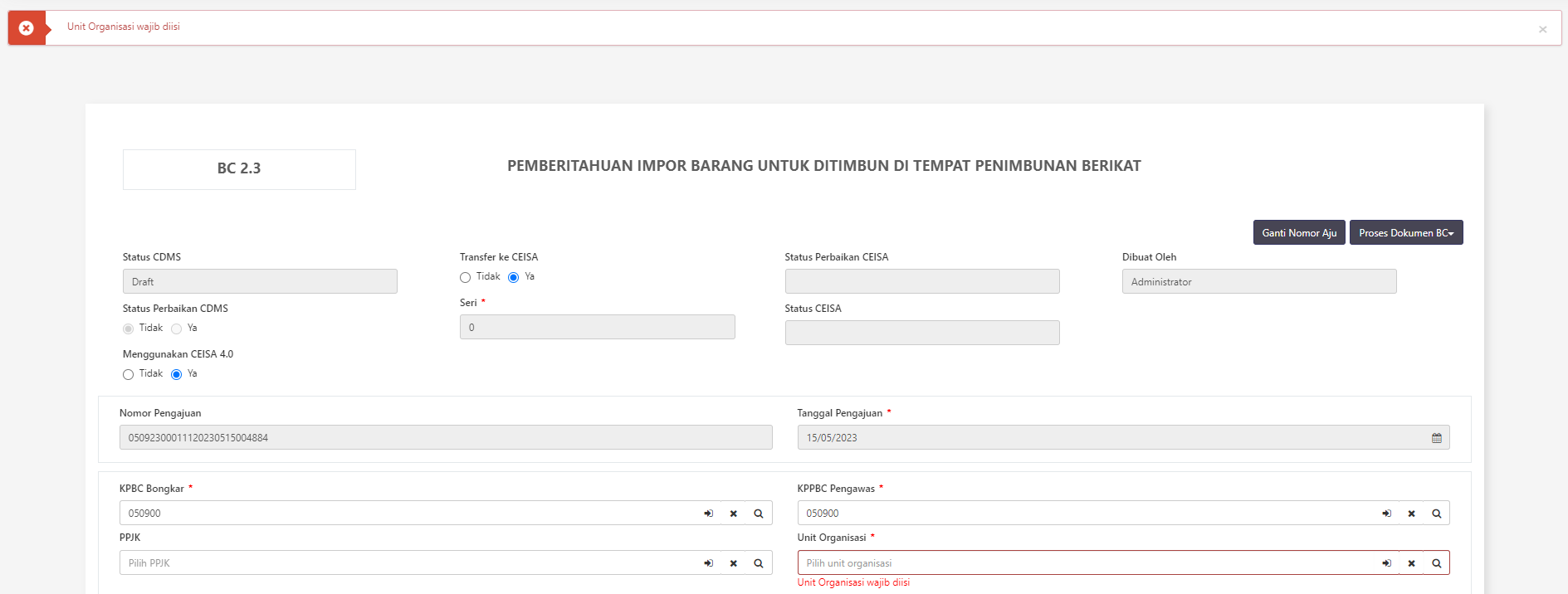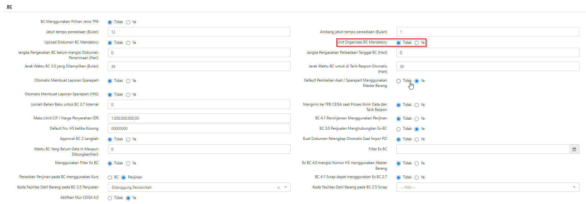 Apabila Unit Organisasi BC Mandatory terisi Ya, maka setiap kali user melakukan pembuatan dokumen BC, maka pada kolom Unit Organisasi harus wajib terisi