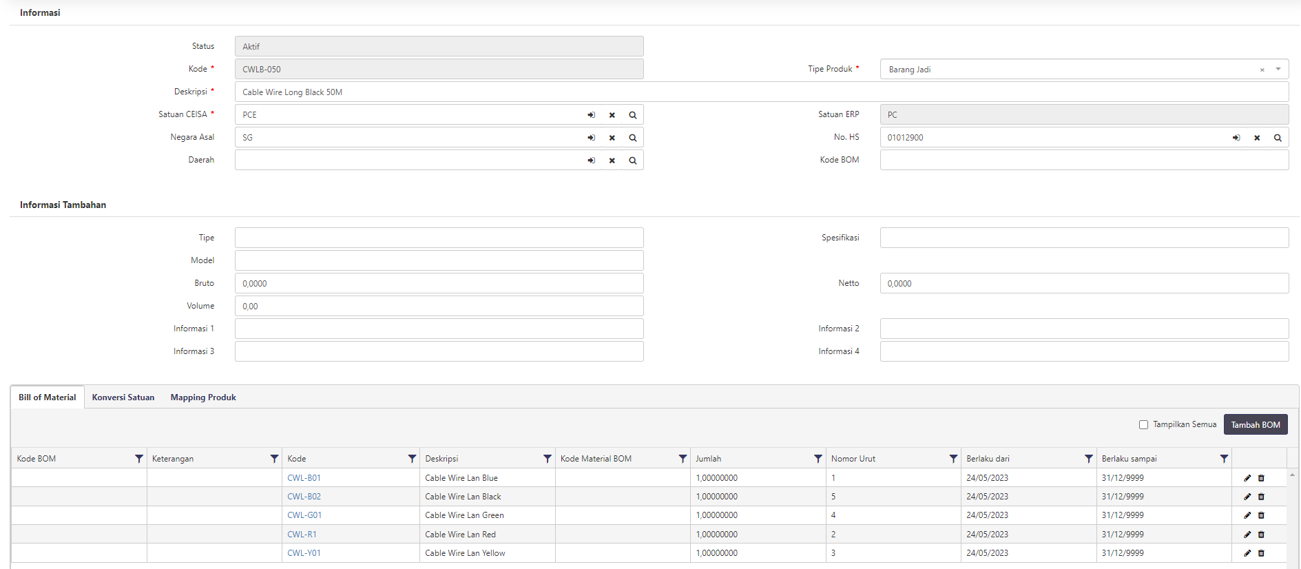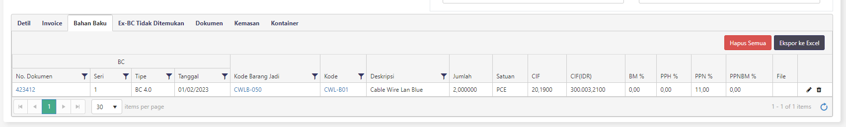Kolom ini berfungsi untuk penggunaan level dari bahan baku, sebagai contoh: Pada Barang Jadi memiliki 5 bahan penyusun, namun pada kolom ini terisi 1, maka ketika digunakan, hanya akan ada 1 bahan baku saja yang digunakan, namun tujuan BC harus ke Internal Berikut ini apabila terisi dengan 1, maka bahan baku yang digunakan hanya 1