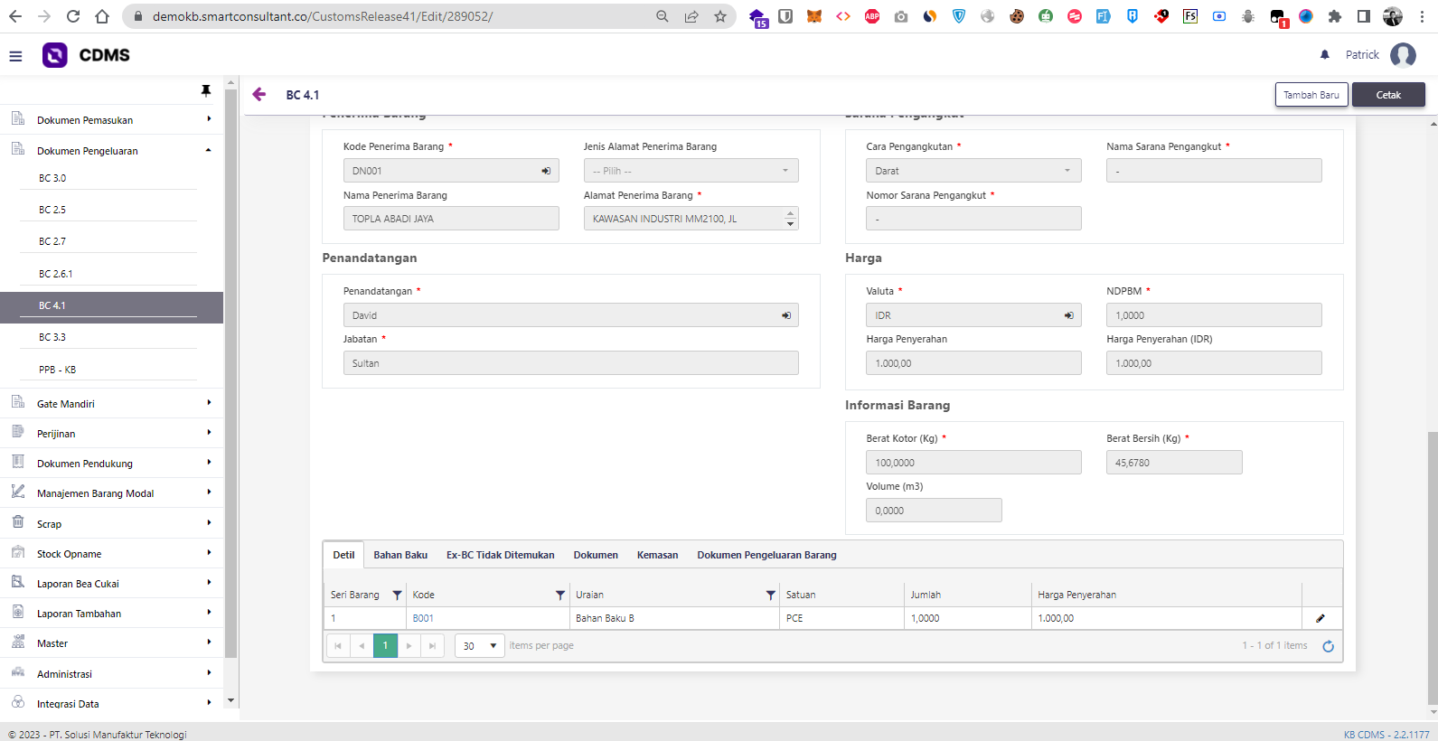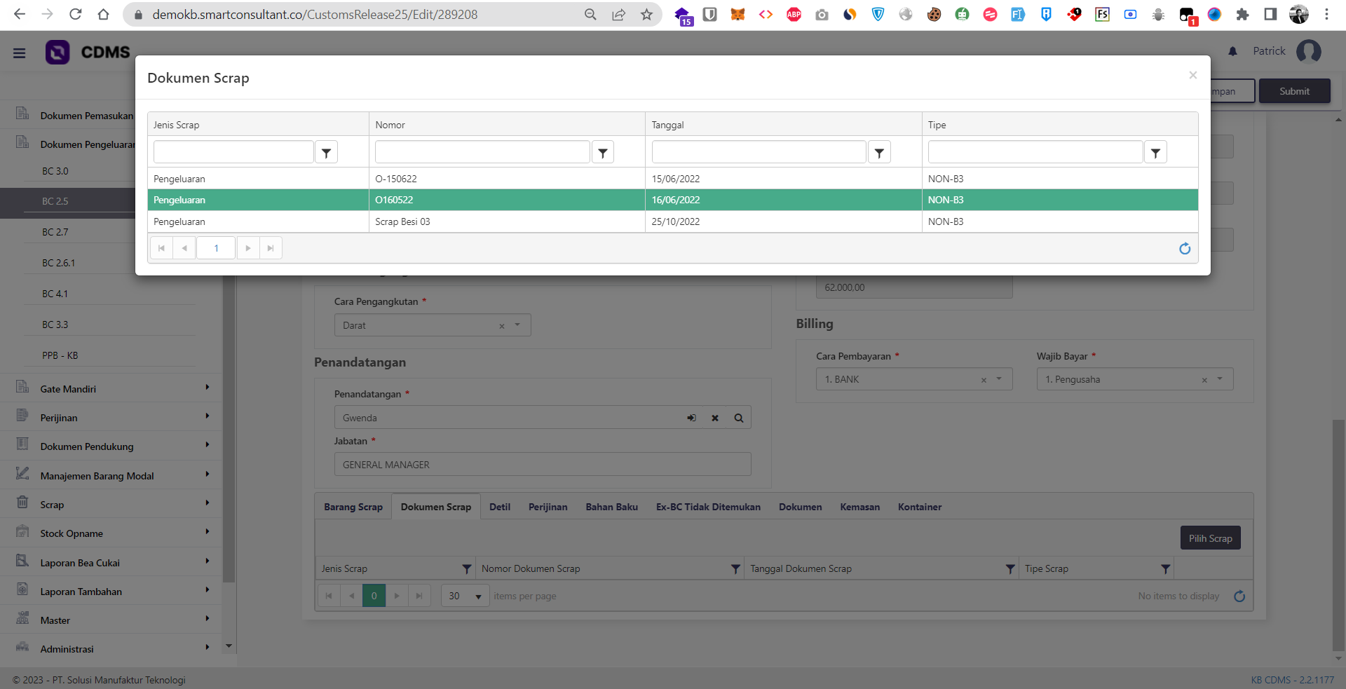 Jika diisi tidak, maka pada BC 2.5 scrap tidak akan ada tab Dokumen Scrap